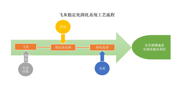 工藝技術(shù):采用以藥劑穩(wěn)定化為主、水泥基固化法為輔的工藝處理技術(shù)。通過藥劑的加入將飛灰內(nèi)的重金屬等有毒有害分子通過化學(xué)反應(yīng)進(jìn)行穩(wěn)定化處理,再利用惰性基材水泥與水反應(yīng)后可形成堅(jiān)固塊體的特征,將有害廢物包容在緊密固化體中,使其中所有污染組分呈現(xiàn)化學(xué)惰性或被包容起來,減少重金屬對周圍環(huán)境的污染。經(jīng)過成型處理的飛灰混合物料具有低毒性、低溶解性、低遷移性,能在較為安全的條件下運(yùn)輸與處置。